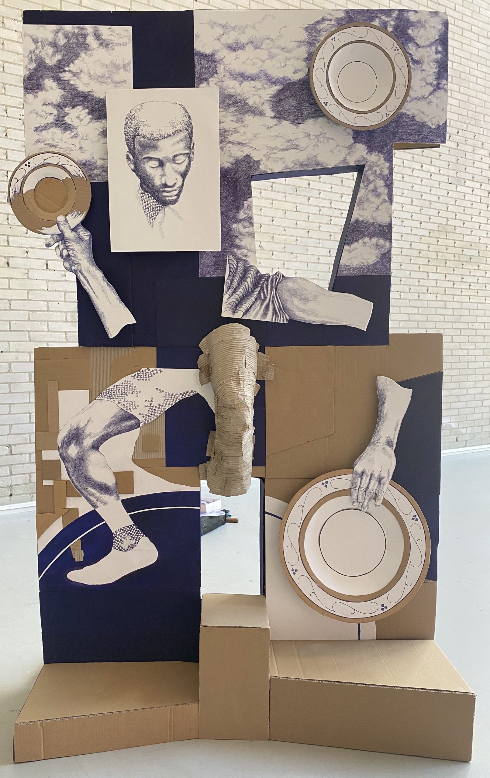 cardboard, paper, blue ballpoint ink, acrylic